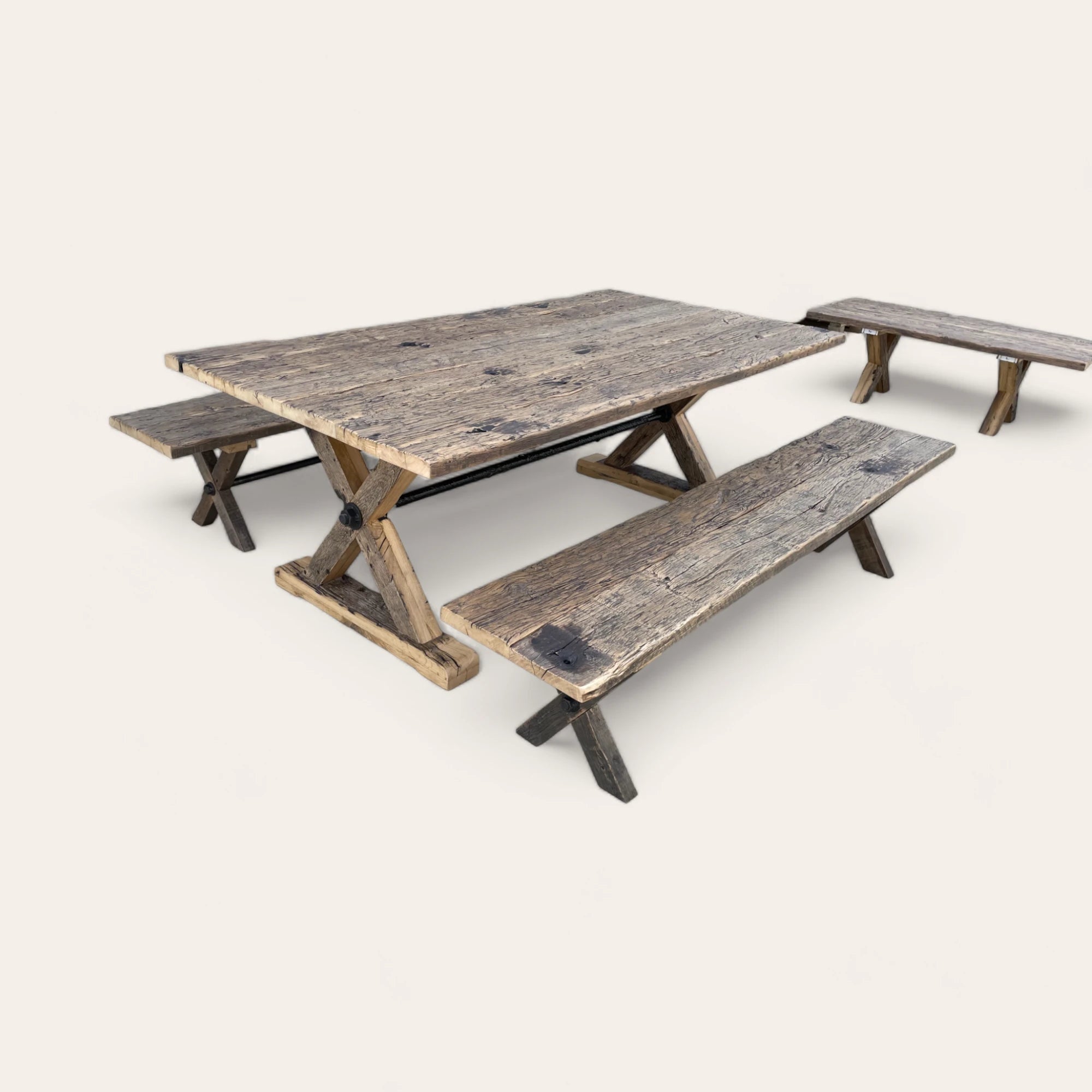 Nos tables basses sont conçus pour mettre en valeur ces caractéristiques uniques. Nous préservons les marques d'usure historiques qui témoignent de la longévité du bois, tout en assurant que chaque pièce est parfaitement finie pour une utilisation confortable et durable dans votre maison. Le bois est traité avec les techniques les plus respectueuses de l'environnement, garantissant que le charme du vieux monde rencontre les standards modernes de durabilité.
