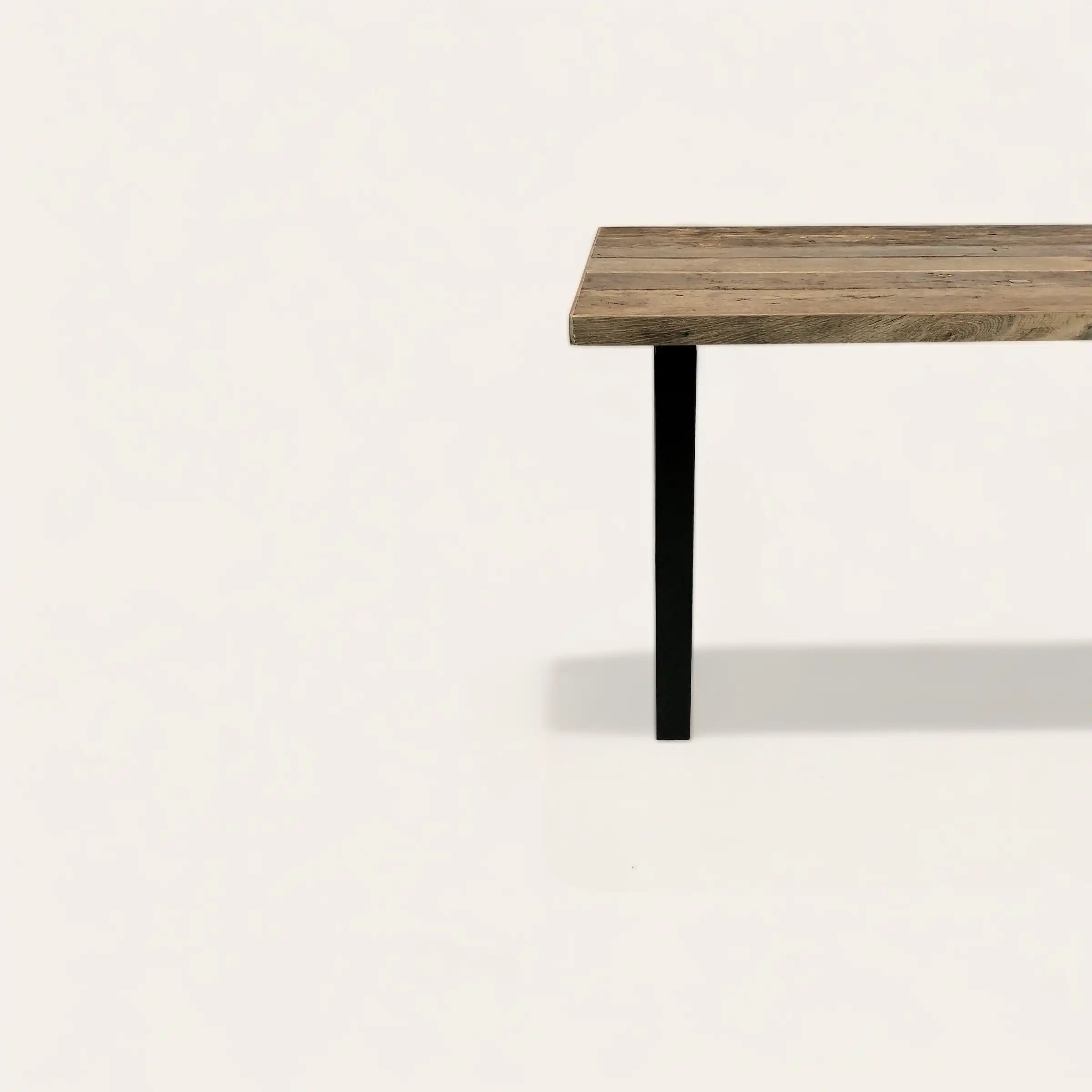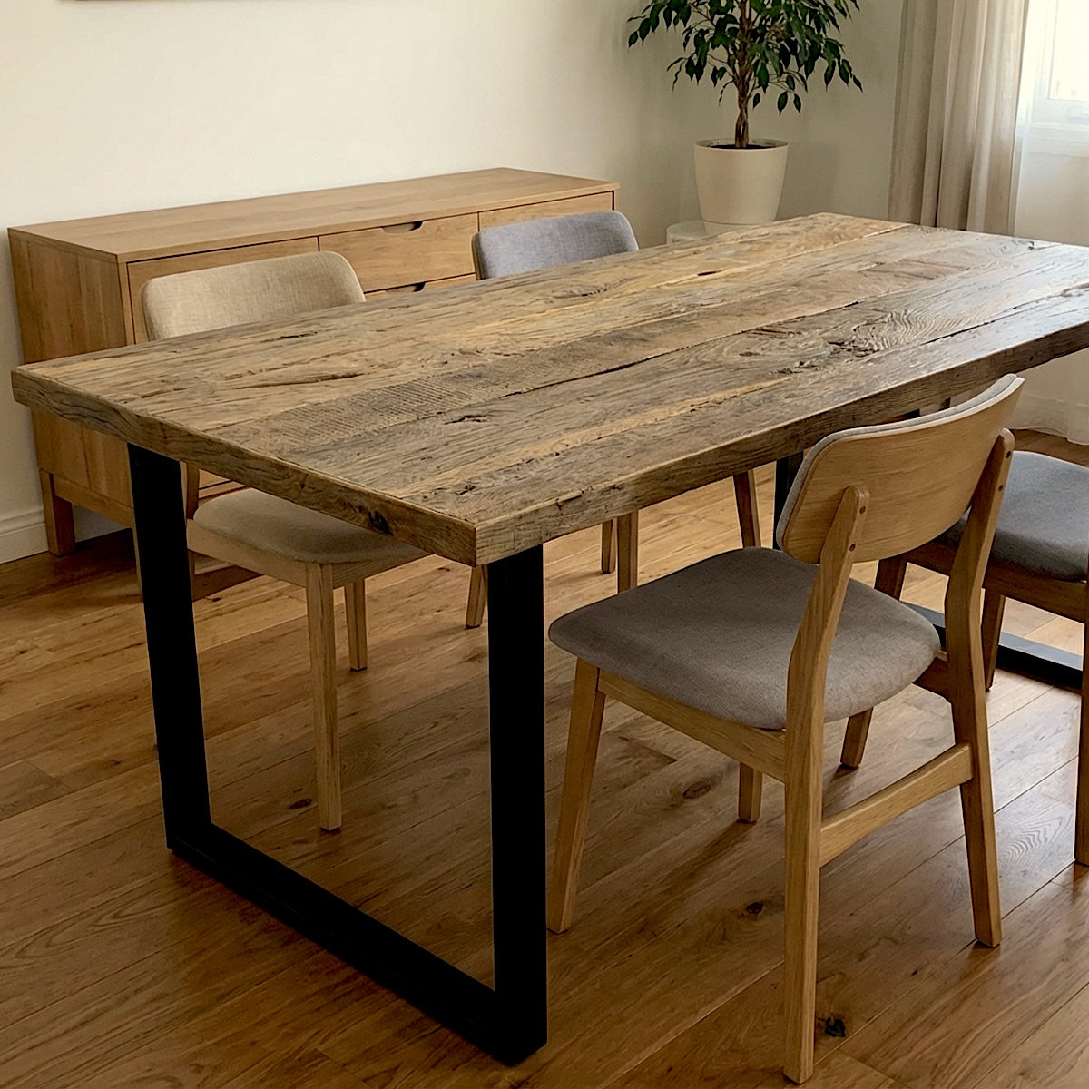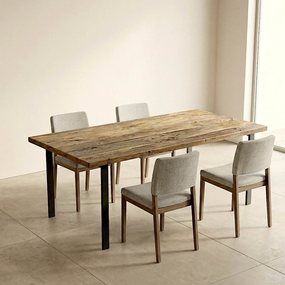La finition n'est pas en reste : les chants des plateaux, habillés avec précision dans le même vieux bois que la surface, offrent une continuité visuelle et un cachet inégalé.