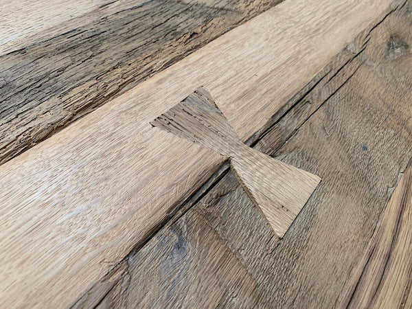 Pour ce plateau, nous sélectionnons méticuleusement des sections de vieilles poutres en chêne, récupérées d'anciens édifices, porteurs d'histoires et de caractère.